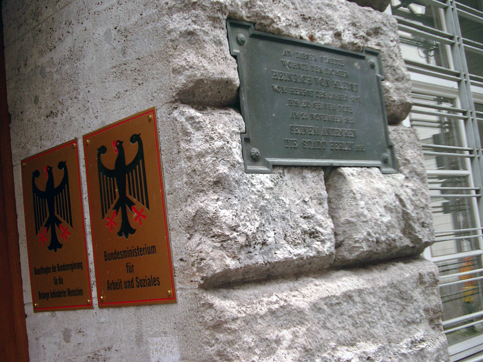 Eine Gedenktafel erinnert an einem Gebäude, das heute zum Bundesministerium für Arbeit und Soziales gehört, daran, dass Kleist an dieser Stelle die letzten Jahre seines Lebens verbrachte.